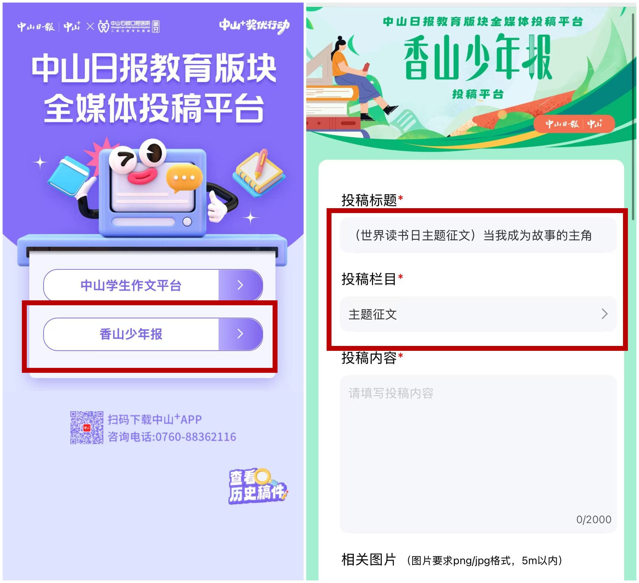 2.點(diǎn)擊“香山少年報(bào)”,在“投稿欄目”選取“主題征文”進(jìn)入。