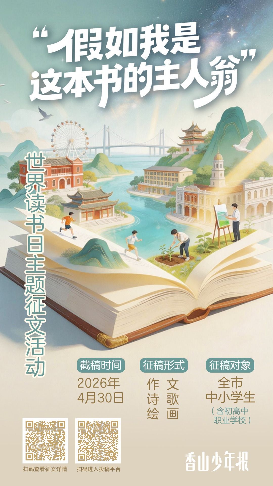 在這個(gè)充滿墨香與詩意的四月,我們迎來了世界讀書日?!断闵缴倌陥?bào)》特發(fā)起“假如我是這本書的主人翁”世界讀書日主題征文活動(dòng),邀請(qǐng)全體中小學(xué)生跨越書頁邊界,化身書中主角,在文字世界里開啟一場(chǎng)專屬奇遇,書寫?yīng)殞儆谀愕纳倌旯适屡c成長(zhǎng)感悟。
