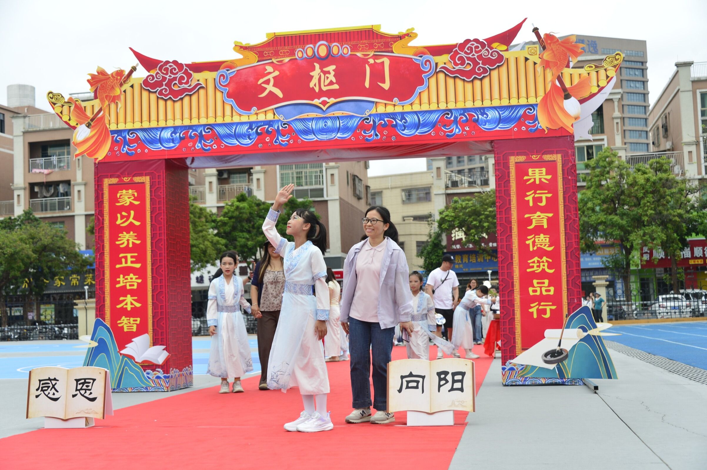 最具傳統(tǒng)韻味的沃盥禮與走文樞門環(huán)節(jié),將儀式感推向高潮。家長陪伴孩子凈手靜心,攜手走過文樞門。寓意洗去稚氣,開啟智慧,邁向人生新階段。