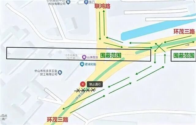 環(huán)茂三路:過往車輛可通過路口東側(cè)臨時(shí)導(dǎo)改路口通行。