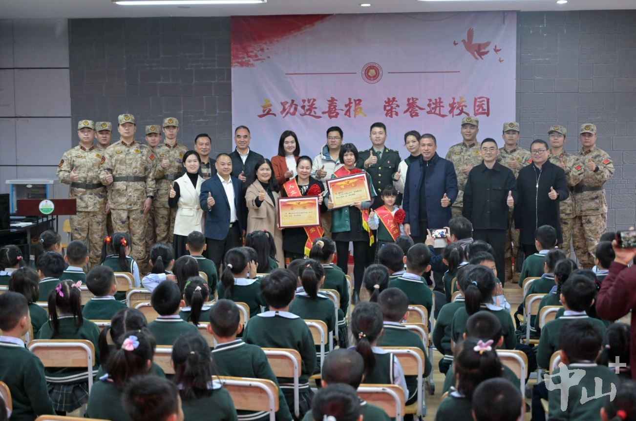 拉橫幅、敲鑼鼓、舞龍獅……2月29日一早,東區(qū)街道竹苑社區(qū)迎來(lái)了一支敲鑼打鼓、舞龍舞獅的隊(duì)伍,一路喜氣洋洋,熱鬧非凡。游行隊(duì)伍將一份立功受獎(jiǎng)的榮譽(yù),帶到了榮立三等功的現(xiàn)役軍人孫鍵女兒孫頌雅所在的竹苑小學(xué),熱鬧的場(chǎng)面吸引許多鄉(xiāng)親、商戶等前來(lái)圍觀祝賀。 聯(lián)合送喜報(bào),儀式感拉滿 校園內(nèi),在讀小學(xué)一年級(jí)的“軍娃”孫頌雅和她的同學(xué)、老師等共同見(jiàn)證了這一榮耀時(shí)刻。東區(qū)街道黨工委書(shū)記周俊峰將三等功喜報(bào)送到孫頌雅一家人手上,市退役軍人事務(wù)局黨組成員、副局長(zhǎng)陳光林為他們送上慰問(wèn)金,并為其佩戴光榮綬帶“一人立功,全家光榮”,一家人臉上洋溢著開(kāi)心且自豪的笑容。  孫頌雅一家人在學(xué)校收到立功喜報(bào)。記者 易承樂(lè) 攝