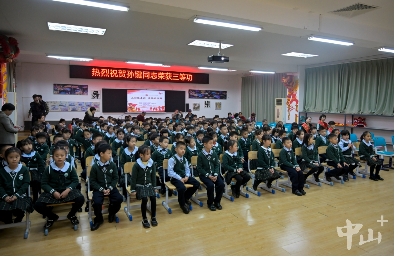 喜報(bào)一頭連著軍心士氣,一頭系著軍屬情懷?;顒?dòng)現(xiàn)場(chǎng),榮立三等功的現(xiàn)役軍人孫鍵通過(guò)視頻向女兒說(shuō)出心里話:“我最親愛(ài)的女兒頌雅,爸爸多么想陪伴在你的身邊,每一個(gè)節(jié)假日,每一天,看著你慢慢地成長(zhǎng)。但是天下雖安,忘戰(zhàn)必危。國(guó)無(wú)防不立,民無(wú)兵不安,爸爸要保家衛(wèi)國(guó)。我的女兒,希望你理解和體諒爸爸的不能陪伴。爸爸也曾經(jīng)是竹苑小學(xué)的學(xué)生,從這里走出去,走向祖國(guó)更需要爸爸的地方……” 據(jù)介紹,2014年起至今,孫鍵在中國(guó)人民解放軍某部隊(duì)服役,因表現(xiàn)突出榮獲“四有”優(yōu)秀士兵、榮立三等功。因常年在部隊(duì),孫鍵不能像其他孩子的父親那樣給予女兒更多關(guān)愛(ài)和陪伴,他們只能通過(guò)手機(jī)交流。 孫鍵的妻子郭麗說(shuō):“丈夫從小就想當(dāng)兵,大學(xué)畢業(yè)后他選擇參軍報(bào)國(guó),我們一直默默支持他。今天的儀式太隆重了,我平時(shí)很少跟女兒講爸爸的工作到底是什么,孩子的性格有點(diǎn)內(nèi)向,爸爸想讓女兒在學(xué)校過(guò)得更開(kāi)心,更開(kāi)朗一些。” 開(kāi)展紅色宣講,愛(ài)國(guó)主義教育進(jìn)校園 記者現(xiàn)場(chǎng)看到,活動(dòng)還邀請(qǐng)了“中國(guó)好人”、東區(qū)街道退役軍人紅旗志愿服務(wù)隊(duì)隊(duì)長(zhǎng)李克為大家上了一堂生動(dòng)的愛(ài)國(guó)主義教育課,并將移動(dòng)軍旅展覽館帶到校園,通過(guò)紅色宣講和軍旅物品展示,把愛(ài)國(guó)情懷厚植于小朋友們幼小的心靈中。  為孩子們上愛(ài)國(guó)主義教育課。記者 易承樂(lè) 攝