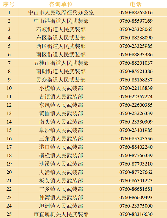 2025年全國(guó)征兵(男兵)應(yīng)征報(bào)名已于12月1日開(kāi)始。記者從中山市人民政府征兵辦公室獲悉,即日起,符合條件的青年可通過(guò)官方渠道報(bào)名參軍,對(duì)于征兵政策和流程存有疑問(wèn)的市民,可通過(guò)撥打各鎮(zhèn)街征兵咨詢(xún)電話(huà)獲得詳細(xì)解答。 應(yīng)征報(bào)名(男兵) 應(yīng)征報(bào)名提示:男兵報(bào)名前須完成兵役登記 全國(guó)征兵(男兵)2025年應(yīng)征報(bào)名時(shí)間 上半年應(yīng)征報(bào)名:2024年12月1日至2025年2月10日24時(shí) 下半年應(yīng)征報(bào)名:2024年12月1日至2025年8月10日24時(shí) 男兵應(yīng)征報(bào)名對(duì)象 高中(含中專(zhuān)、職高、技校)畢業(yè)生及以上文化程度的青年(含高校在校生),年滿(mǎn)18至22周歲(2003年1月1日——2007年12月31日出生);普通高等學(xué)校本專(zhuān)科畢業(yè)生、上半年符合畢業(yè)條件的畢業(yè)班學(xué)生,年滿(mǎn)18至24周歲;研究生畢業(yè)生及在校生放寬至26周歲;初中畢業(yè)文化程度男青年,年滿(mǎn)18至20周歲。 應(yīng)征報(bào)名(女兵) 全國(guó)征兵(女兵)2025年應(yīng)征報(bào)名時(shí)間 上半年應(yīng)征報(bào)名:2025年1月1日至2025年2月10日24時(shí) 下半年應(yīng)征報(bào)名:2025年7月1日至2025年8月10日24時(shí) 女兵應(yīng)征報(bào)名對(duì)象 上半年應(yīng)征報(bào)名:普通高等學(xué)校和科研機(jī)構(gòu)全日制應(yīng)屆畢業(yè)生及在校生,年滿(mǎn)18至22周歲(2003年1月1日——2007年12月31日出生),全日制研究生應(yīng)屆畢業(yè)生及在校生放寬至26周歲;2024年普通高等學(xué)校全日制本專(zhuān)科應(yīng)屆畢業(yè)生可以報(bào)名參加2025年上半年女兵征集,年齡放寬至23周歲。 下半年應(yīng)征報(bào)名:普通高中應(yīng)屆畢業(yè)生、普通高等學(xué)校和科研機(jī)構(gòu)全日制應(yīng)屆畢業(yè)生及在校生,年滿(mǎn)18至22周歲(2003年1月1日——2007年12月31日出生),全日制研究生應(yīng)屆畢業(yè)生及在校生放寬至26周歲。 報(bào)名方式 報(bào)名方式征兵報(bào)名官方網(wǎng)站:全國(guó)征兵網(wǎng) www.gfbzb.gov.cn 軍隊(duì)媒體移動(dòng)旗艦客戶(hù)端:中國(guó)軍號(hào)App 中山各鎮(zhèn)街征兵咨詢(xún)電話(huà)