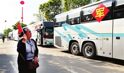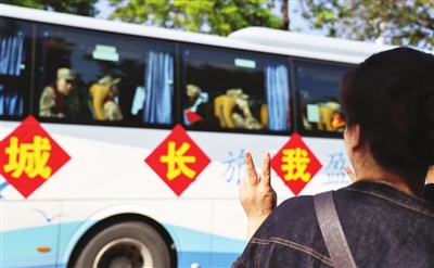 ▲家長手舉國旗,一路目送孩子開啟新的軍旅生涯。 記者 文波 攝