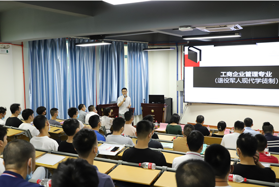 “狹路相逢勇者勝,在座的各位從繁忙的工作崗位上走出來,邁出繼續(xù)學(xué)習(xí)的關(guān)鍵一步,勇氣可嘉。三年后,相信大家一定會收獲知識、技能、學(xué)歷,更好地開啟新征程?!蓖艘圮娙爽F(xiàn)代學(xué)徒制項目開學(xué)典禮上,經(jīng)管學(xué)院院長肖紅在致辭中對新生們表示歡迎和祝賀,并表達了殷切期望,希望大家在求學(xué)期間,修德修身、克勤克儉、心懷理想,腳踏實地,融入多姿多彩的校園生活,在學(xué)生當(dāng)中彰顯軍人本色和榜樣力量。 市退役軍人事務(wù)局相關(guān)負(fù)責(zé)人對項目順利開班表示祝賀,對學(xué)院在項目申報、招生等工作中的辛勤付出表示衷心感謝。他介紹了項目實施的背景,指出開展退役軍人現(xiàn)代學(xué)徒制教育,是退役軍人安置工作的一項重要內(nèi)容,通過現(xiàn)代學(xué)徒制,讓大家成為全日制大學(xué)生,進行正規(guī)系統(tǒng)的高等職業(yè)教育,是黨和政府送給同學(xué)們的一份沉甸甸的“大禮包”。同時,要求新生們盡快適應(yīng)由士兵到大學(xué)生的角色轉(zhuǎn)變,勤學(xué)善思,掌握就業(yè)創(chuàng)業(yè)本領(lǐng),發(fā)揚軍隊能打勝仗的優(yōu)良傳統(tǒng),爭創(chuàng)佳績,為祖國和地方經(jīng)濟建設(shè)再立新功。 學(xué)院工商管理專業(yè)主任沈孟康介紹了學(xué)校和學(xué)院概況,就學(xué)生日常管理、教學(xué)內(nèi)容、方式和計劃等作詳細(xì)說明。表示學(xué)校將采取在崗培養(yǎng)與學(xué)校培養(yǎng)相結(jié)合,堅持“標(biāo)準(zhǔn)不降、模式多元、學(xué)制靈活”,線上與線下混合教學(xué),實行工學(xué)交替、靈活多元的教學(xué)模式。經(jīng)管學(xué)院已配備了教授、博士等“精銳”師資團,“量身定制”人才培養(yǎng)方案,全力保障“八一班”的教育教學(xué)質(zhì)量。