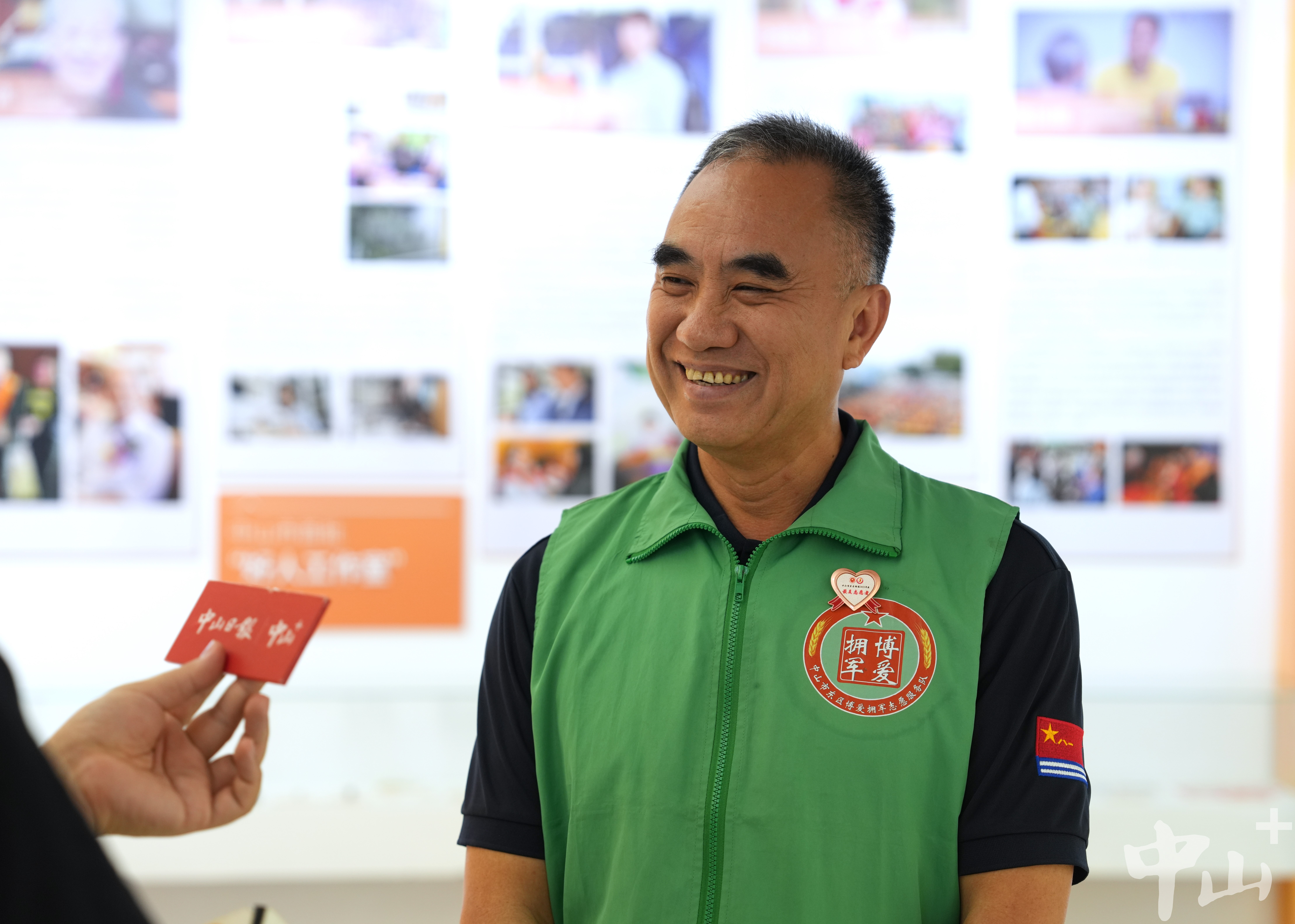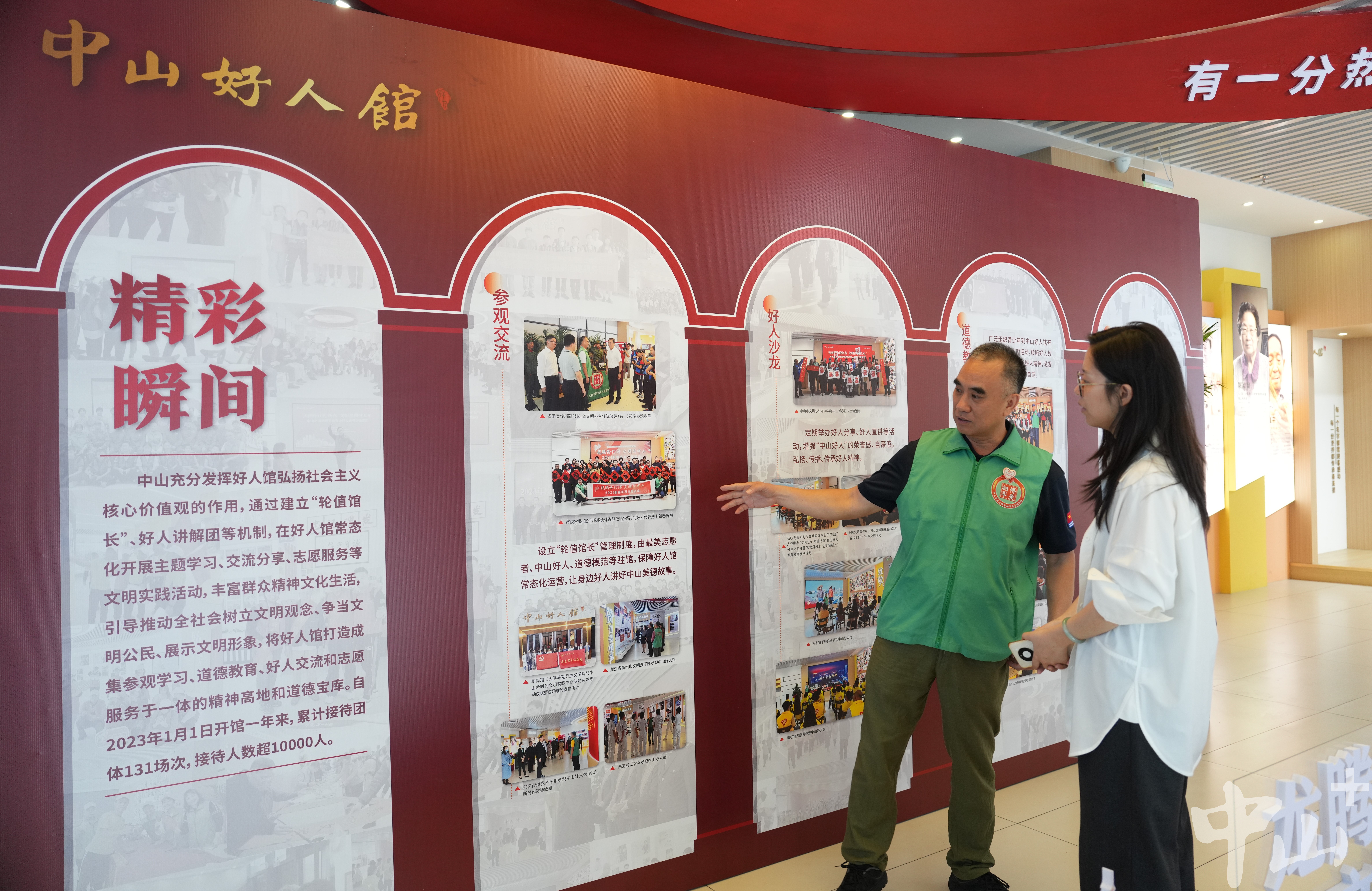 作為一名退伍軍人,李克有很多曾一起在戰(zhàn)場上出生入死的戰(zhàn)友,其中不乏已經(jīng)為國捐軀的烈士。自2007年起,他便自發(fā)組織尋找犧牲的中山籍戰(zhàn)友,先后6次帶隊前往廣西邊境的多個烈士陵園,成功尋到29名犧牲戰(zhàn)友信息,并將相關(guān)信息報送給中山市退役軍人事務(wù)局。 “我有一位戰(zhàn)友,寧愿把生的希望留給其他人,19歲不到就犧牲在戰(zhàn)場上。他們已經(jīng)離我們而去,更重要的是我們能為他們做些什么。所以逢年過節(jié)我都會看望他們的家人,把歡樂也帶給老人家?!崩羁苏f。 2016年,得知戰(zhàn)友的女兒患先天性心臟病,須進(jìn)行心肺聯(lián)合移植手術(shù),李克立即帶頭捐款,并聯(lián)系政府相關(guān)部門和電視臺,通過媒體報道讓更多愛心人士關(guān)注到了這位困難老兵。在他的多方奔走下,社會各界紛紛伸出援助之手,募集醫(yī)藥費(fèi)40余萬元,助戰(zhàn)友的女兒順利完成了手術(shù)。 牽頭成立志愿服務(wù)隊 延續(xù)志愿精神 作為一名有著30多年志愿服務(wù)經(jīng)歷的資深志愿者,李克的生活已經(jīng)與志愿分不開。他的身上始終有一抹綠色:在軍營,是守衛(wèi)國門的綠軍裝;在社區(qū),是服務(wù)群眾的綠馬甲。在人民群眾需要的地方,李克每次都沖在最前線。 “2020年疫情暴發(fā)時,很多人都響應(yīng)號召待在家里,我覺得作為一個打過仗的老兵,我總得站出來做點事?!睕]有過多考慮,李克第一時間加入到了志愿者隊伍中,并在社區(qū)堅守了整整60天。當(dāng)時防護(hù)物資匱乏,李克還自掏腰包托人在廣州購買了6萬元左右的防護(hù)物資,全部捐贈給了在一線抗疫的工作人員。 近年來,李克還積極捐資助學(xué)、支援災(zāi)區(qū)、扶危濟(jì)困,連續(xù)6年資助6名困難學(xué)生,為汕尾市陸河中學(xué)捐贈10套多媒體電腦設(shè)備,堅持參與無償獻(xiàn)血直到60歲。 2018年起,李克擔(dān)任文明城市巡查監(jiān)督員,奔走在街道各個路口、每條小巷,整理亂停亂放的共享單車,清理“牛皮癬”小廣告,保障街頭巷尾干凈衛(wèi)生。同一年,為更有組織地開展志愿活動,李克牽頭成立了一支以退役軍人為主導(dǎo)的東區(qū)博愛擁軍志愿服務(wù)隊,把戰(zhàn)友們凝聚在一起,共同為社會作貢獻(xiàn)。如今,這支志愿服務(wù)隊已從最初的8名成員,逐漸壯大至400多人,成為服務(wù)社會的一支生力軍。 講好好人故事,傳承紅色文化 4月19日上午,記者在“中山好人館”見到了正在擔(dān)任“輪值館長”的李克。從去年1月開始,他每個月都參與輪值,先后為140多場活動、1萬多名市民群眾義務(wù)講解博愛之城的凡人善舉、好人大愛。  正在中山好人館輪值的李克。記者 劉萬杰 攝