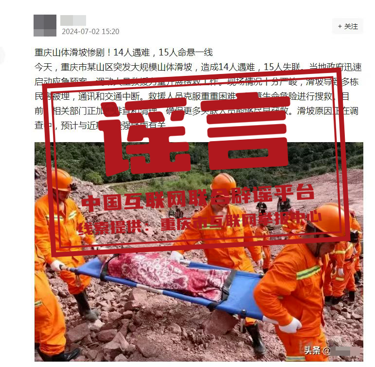 真相:7月2日,某網(wǎng)民發(fā)布信息稱,“重慶市某山區(qū)突發(fā)大規(guī)模山體滑坡,造成14人遇難,15人失聯(lián)。”經(jīng)相關(guān)部門核實(shí),重慶近日未發(fā)生相關(guān)地質(zhì)災(zāi)害,網(wǎng)傳信息系謠言。(來源:重慶辟謠)