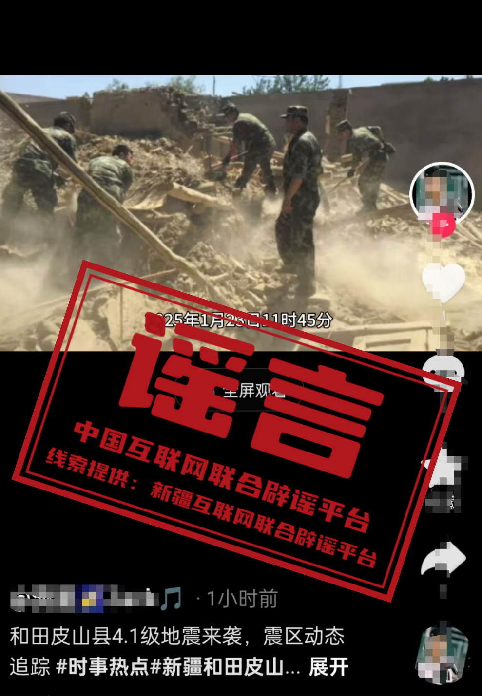 真相:中國地震臺(tái)網(wǎng)正式測定,2025年01月23日11時(shí)45分在新疆皮山縣(緯度36.94°,經(jīng)度78.87°)發(fā)生4.1級地震,震源深度15公里,震中附近地形類型為山地,5公里范圍內(nèi)平均海拔高度為2484米,距離皮山縣92公里。個(gè)別網(wǎng)民關(guān)聯(lián)此次地震,發(fā)布“房屋倒塌、道路坍塌及應(yīng)急救援”等謠言圖片和短視頻,博取流量誤導(dǎo)網(wǎng)民。經(jīng)皮山縣應(yīng)急管理局核實(shí),此次地震未造成人員傷亡及財(cái)產(chǎn)損失。對編造散布地震謠言擾亂公共秩序、造成惡劣社會(huì)影響的行為,公安機(jī)關(guān)將依法依規(guī)嚴(yán)肅查處。請廣大網(wǎng)民擦亮眼睛,勿輕信傳播非正規(guī)來源、未經(jīng)證實(shí)的地震信息。(來源:新疆網(wǎng)絡(luò)辟謠)