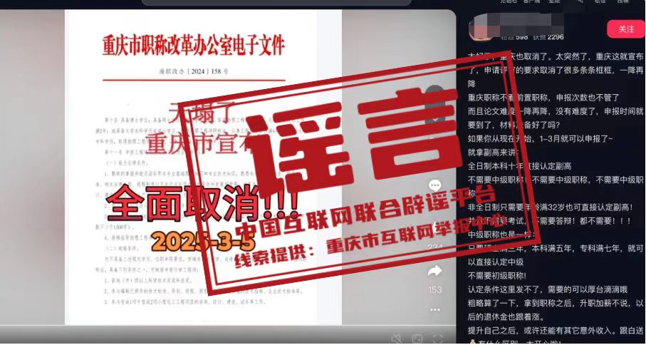 真相:近日,有網(wǎng)民在互聯(lián)網(wǎng)平臺(tái)發(fā)布消息稱“重慶市宣布,申請(qǐng)?jiān)u審的要求取消了很多條條框框,職稱申請(qǐng)不看前置職稱,全日制本科十年直接認(rèn)定副高,不需要中級(jí)職稱”,引發(fā)關(guān)注。經(jīng)核實(shí),網(wǎng)傳信息系謠言。職稱評(píng)審均需逐級(jí)晉升,取得上一級(jí)職稱并滿足相應(yīng)學(xué)歷資歷條件后方可晉升高一級(jí)職稱。目前重慶市除特殊人才、博士后等3個(gè)針對(duì)特定對(duì)象的職稱申報(bào)綠色通道外,正常申報(bào)通道均需逐級(jí)晉升。網(wǎng)傳文件是網(wǎng)民通過P圖軟件編輯而成,試圖吸引不明真相的群眾咨詢,借機(jī)推銷職稱代辦服務(wù),收取高額費(fèi)用。目前,謠言線索已轉(zhuǎn)交公安機(jī)關(guān)進(jìn)一步調(diào)查處置。(來源:“重慶辟謠”微信公眾號(hào))